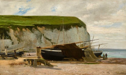 Nordfranzösische Strandpartie mit Segelschiffen.