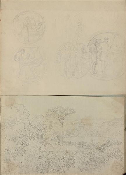 | Deux dessins sur le même montage: feuille d’étude avec personnages et une vue de Castel Gondolfo | |
