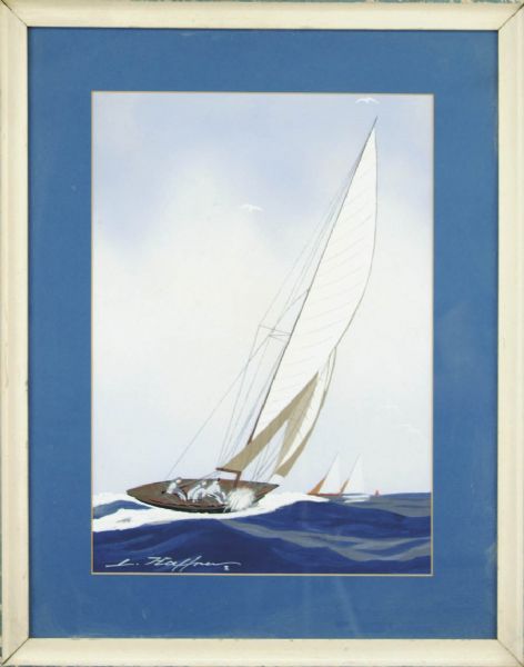 Gouache scene shows a racing yacht with sails full and three men aboard