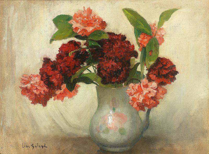Nelkenstrauß in weißer Henkelvase, vor hellem Wandhintergrund