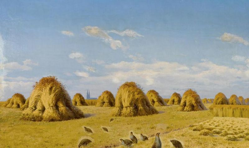 A view of Chartres Cathedral across a hayfield with partridges in the foreground