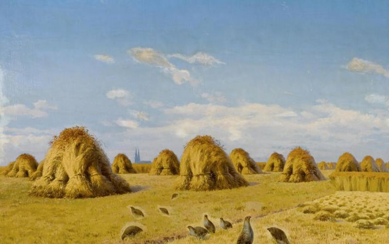 | A view of Chartres Cathedral across a hayfield with partridges in the foreground | |