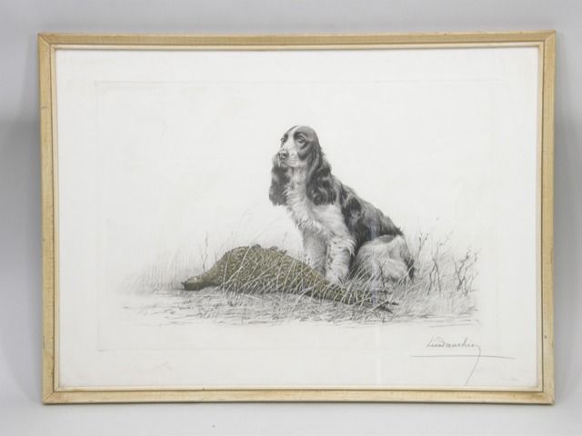Spaniel beside pheasant catch in habitat