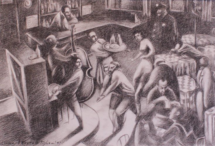 Speak Easy Bustling Interior Scene with Patrons and Police Officer