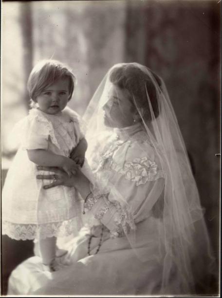 | Très beau portrait de madame Misonne sous une voilette tenant son enfant debout à ses cotés. | |