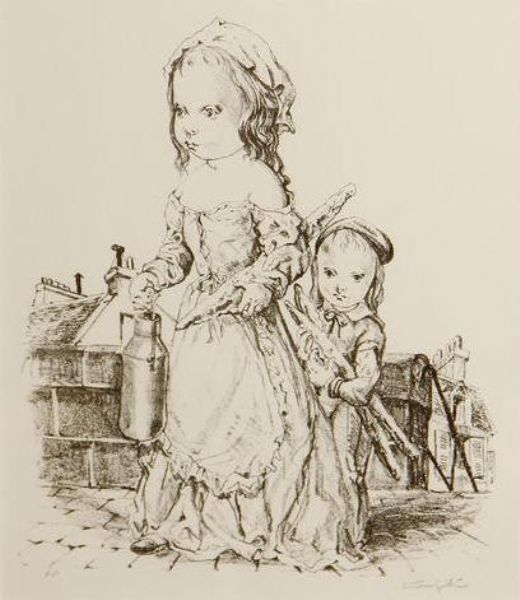 Jeune Fille et Enfant a la Baguette et au Pot au Lait