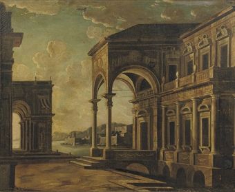 | An architectural 'capriccio' with a coastal landscape beyond | |