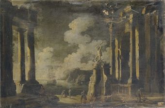 Capriccio architettonico con statua di Ercole e figure