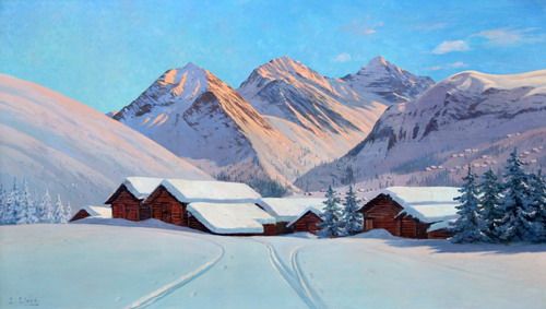 Boerderijen in de sneeuw bij de Jungfrau in Zwitserland.