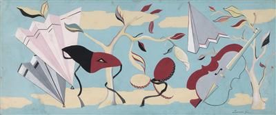 | Tableau décoratif (avec éventails, masque, arbres, violoncelle et tambours) | |