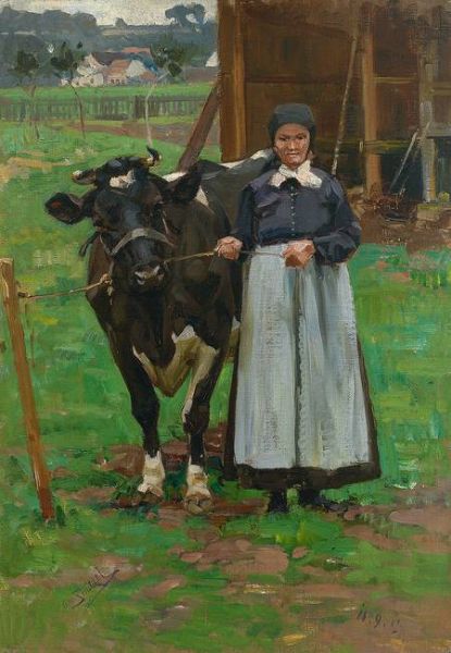 | Bäuerin mit Kuh vor offenem Stall. Seitlich Durchblick auf Dorflandschaft mit Weide. Meisterliche typische Impression | |