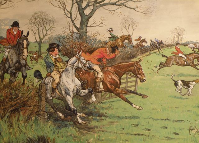 | A caricature of the hunt in full cry with riders leaping a hedge, two squeezing through a gate, and some horses riderless | |