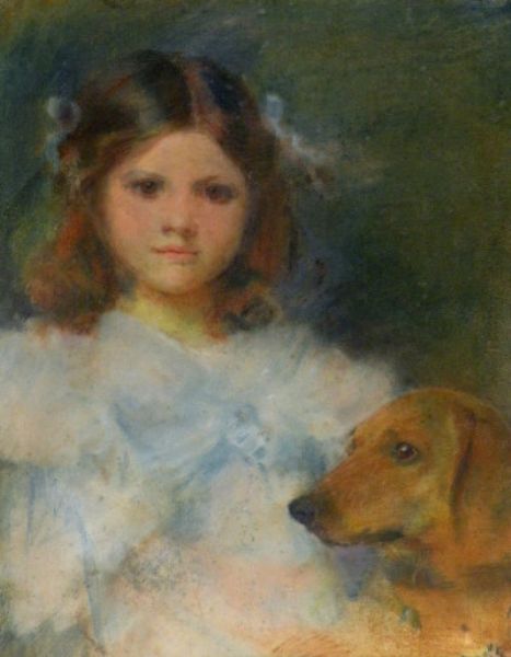 'Portrait of a little girl with her pet dachshund'