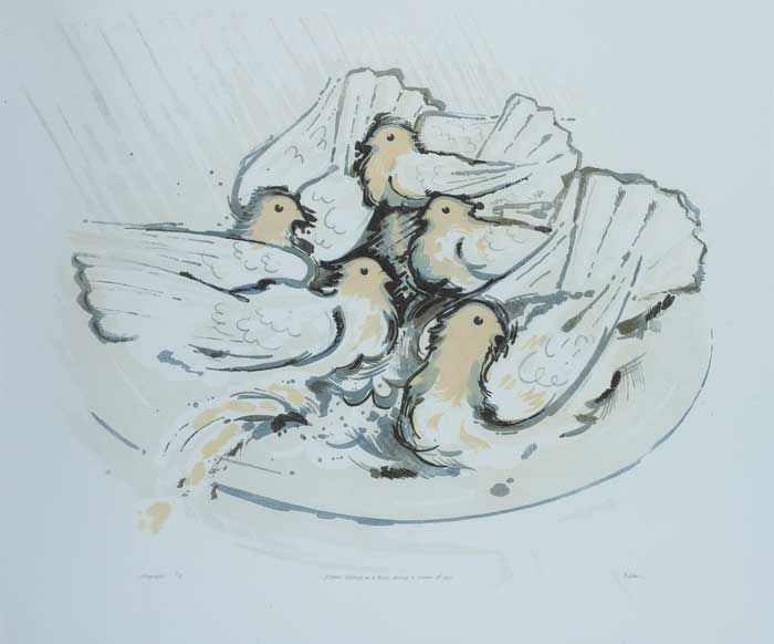 PIGEONS BATHING IN A BASIN DURING A SHOWER OF RAIN