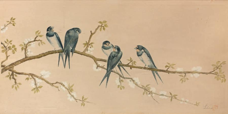 Print representing swallows perched on a flowering pear branch.