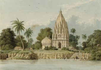 | Village and pagoda below Patna Azimabad, on the Ganges | |