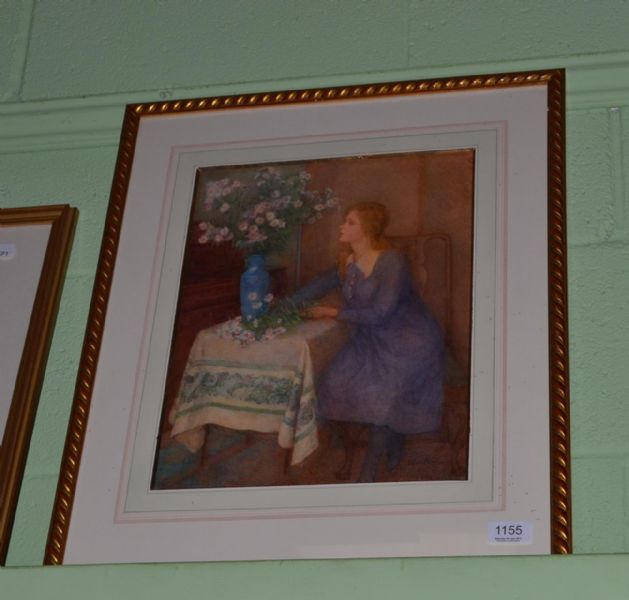 | Flowers of Autumn A young lady seated at a table arranging chrysanthemums in a vase | |