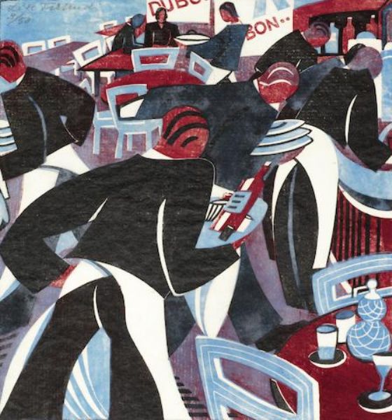 Linocut printed in dark blue