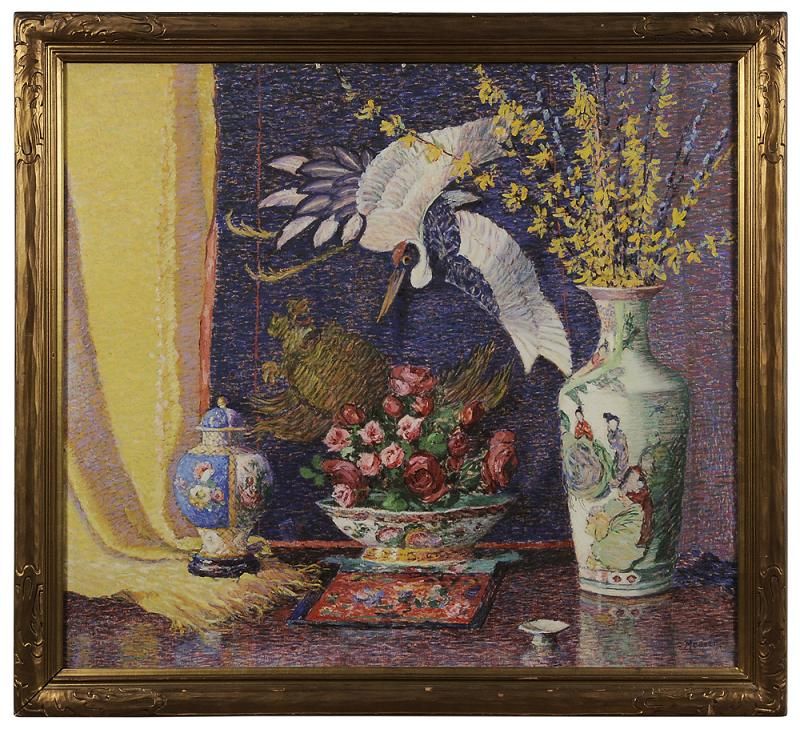 ) Still Life With Roses, Forsythia, and Asian Porcelain