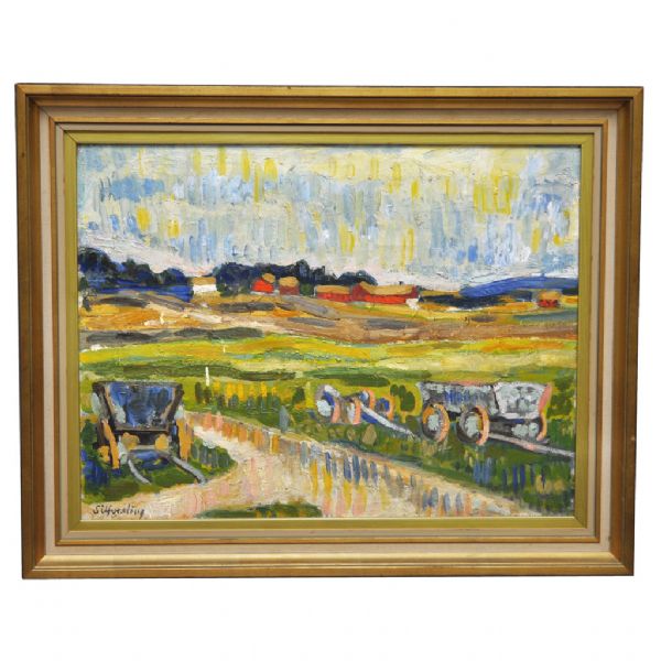 Lantligt landskapsmotiv med vagnar i förgrunden och gård i bakgrunden