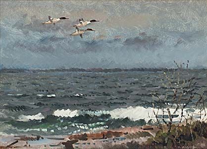 Kustmotiv med sträckande änder.