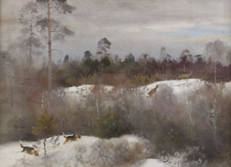 Stövare och rådjur i vinterlandskap