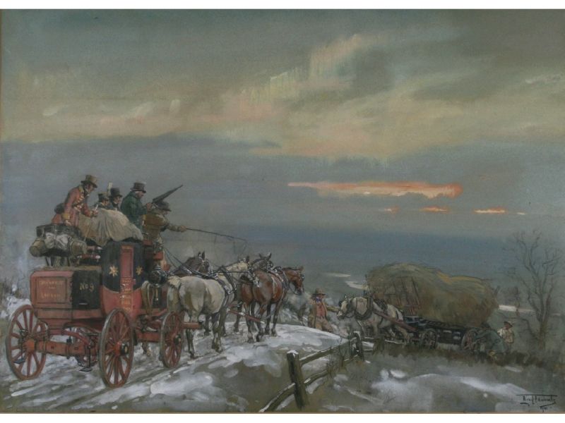 | A fully laden coach meeting a hay wain on the brow of a hill, winter scene | |
