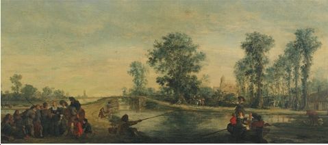 | RIVER LANDSCAPE WITH ELEGANT FIGURES CONVERSING WHILE A PIPER PLAYS AND TOWNSFOLK PROMENADE ON THE OPPOSITE SHORE | |