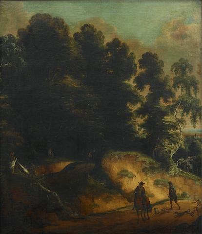 | A wooded landscape with huntsmen and their dogs on a track | |