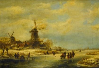 | LANDSCAPE WITH VILLAGERS ON A FROZEN WATERWAY | |