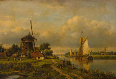 River scene with fishers on a bank and a windmill in the foreground