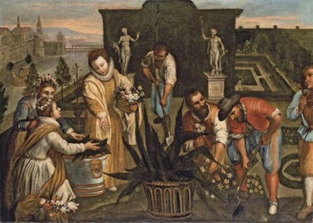 | A lady holding a basket of flowers and gardeners planting in a Renaissance garden, a fortified town next to a river beyond | |