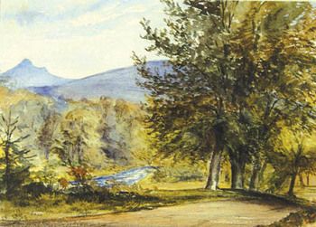 | ) Scottish landscape, a stream passing through woodland with mountains in the background | |