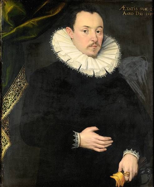 | Portrait of a gentleman, half-length, in black costume with a white lace ruff, holding a pair of gloves and standing before a gr | |