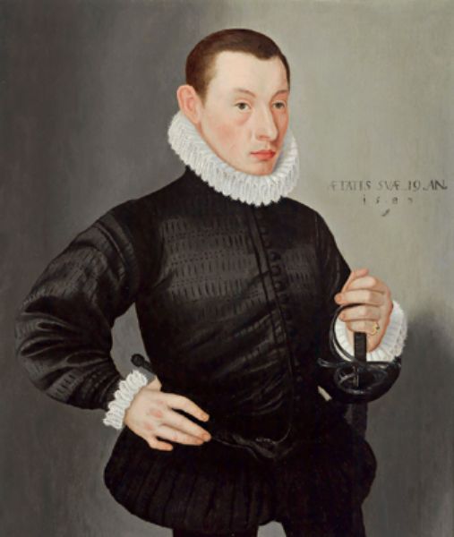 | ortrait of a gentleman in a black doublet and white lace collar, holding a sword in his left hand | |