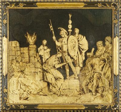 | Roman historical scene; Scene of a sacrifice, en grisaille in dark green and gold | |