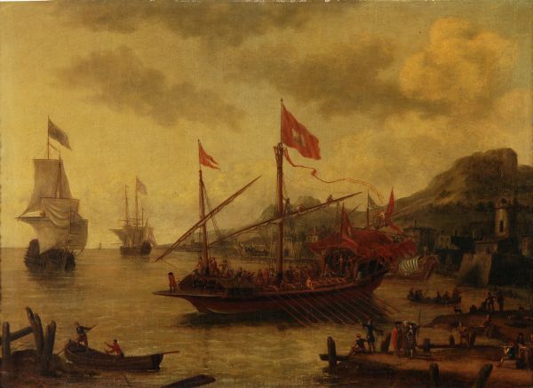 | A Mediterranean harbour scene, with merchants trading on the quay, and ships beyond | |