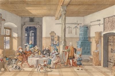 An interior: a table in Schloss Tratzberg/Tirol with historic staffage
