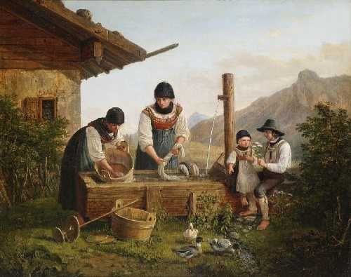 Bei der Wäsche vor einem Gebirgsbauernhaus