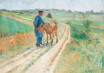 Bonde med mula på landsväg