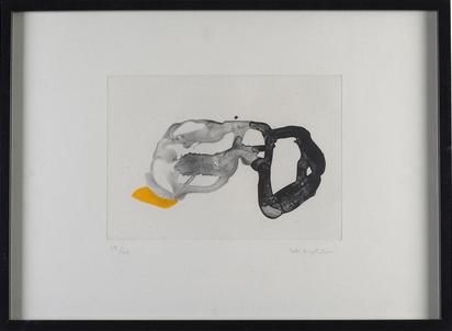 Abstrakt komposition i gult, grått och svart mot vit botten