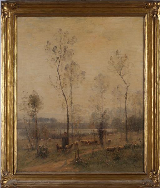 LANDSCAPE WITH SHEPHERDESS AND FLOCK NEAR A WOODED POND