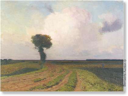 | Paysage vaste à arbre solitaire et paysan au travail aux environs de Drente | |