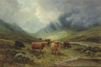 A Highland landscape with cattle beside a river