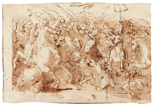 | RECTO: BATTLE SCENE WITH MEN ON HORSEBACK VERSO: PARTIAL STUDY OF A DRAPED FIGURE | |