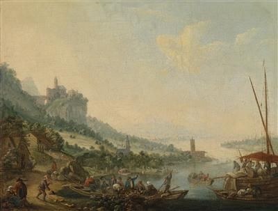 | A river landscape with a ferry boat and a castle on a hill | |