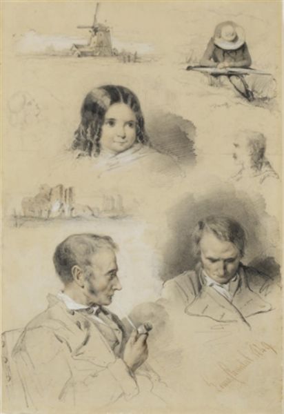 | Feuille d'étude avec deux petits paysages, quatre têtes d'hommes et un visage de fillette | |