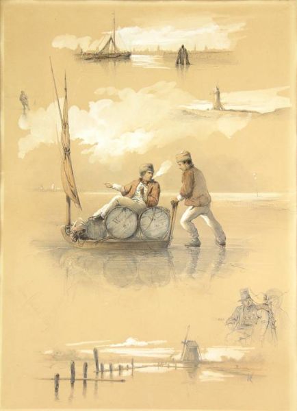 | Man on ice-skates pushing a sledge loaded with barrels with a pipe-smoking man sitting on top | |