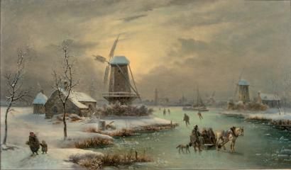 Chariot et patineurs sur une rivière gelée