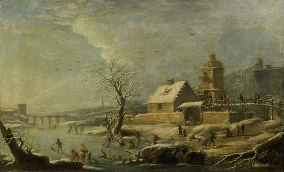 PAYSAGE D'HIVER ANIME DE PERSONNAGES ET PATINEURS.
